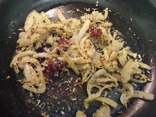 1) Cut 1 onion lenghtwise. Heat very little oil in a pan and roast the onions, red chillies and all the spices along with the shredded coconut and blend it to a smooth paste with little water if required.